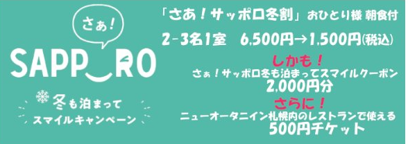 【さあ!サッポロ冬割】宿泊プランでご宿泊のお客様に1名様1泊あたり\2,000分の【冬も泊まってスマイルクーポン】をホテルチェックイン時にお渡しいたします。